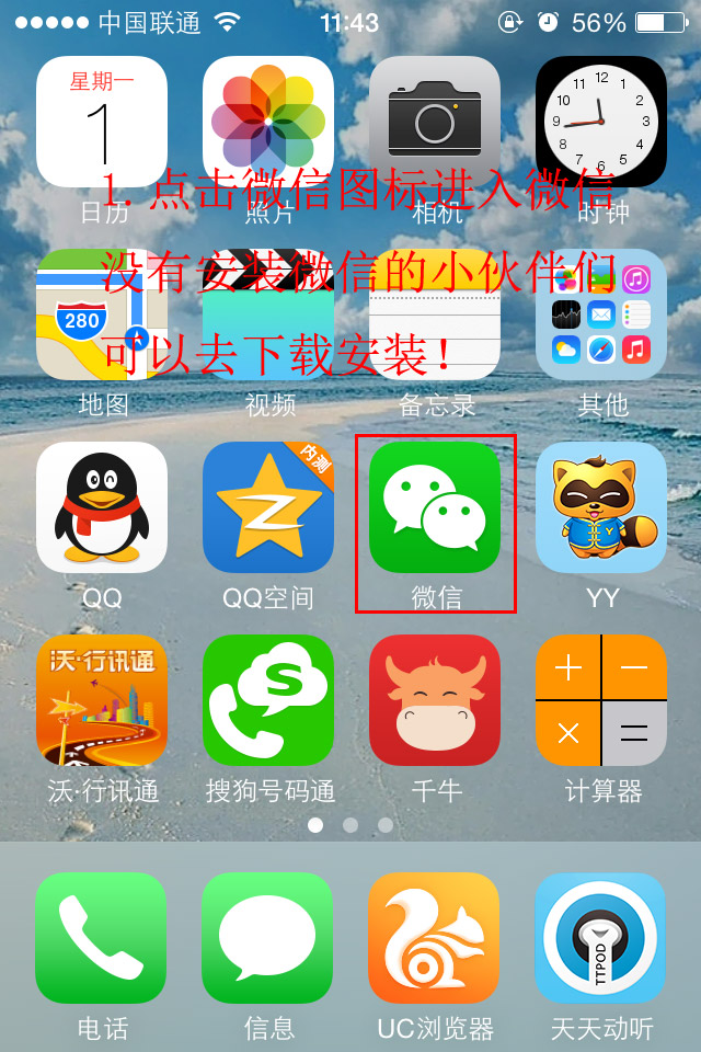 第一步:點(diǎn)擊手機(jī)中安裝的微信圖標(biāo)(沒(méi)有下載的小伙伴們和去微信官網(wǎng)下載安裝,IOS用戶(hù)可以去Appstore或者pp助手等途徑獲得)