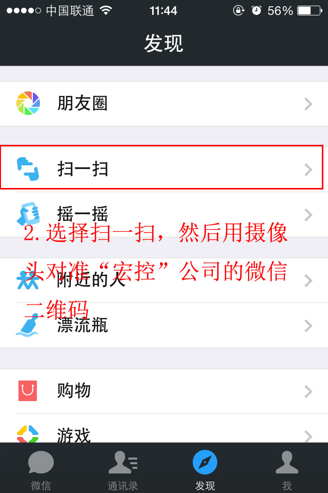第二步:進(jìn)入到微信的發(fā)現(xiàn)選項(xiàng),選擇掃一掃,然后對(duì)準(zhǔn)宏控公司的微信二維碼即可