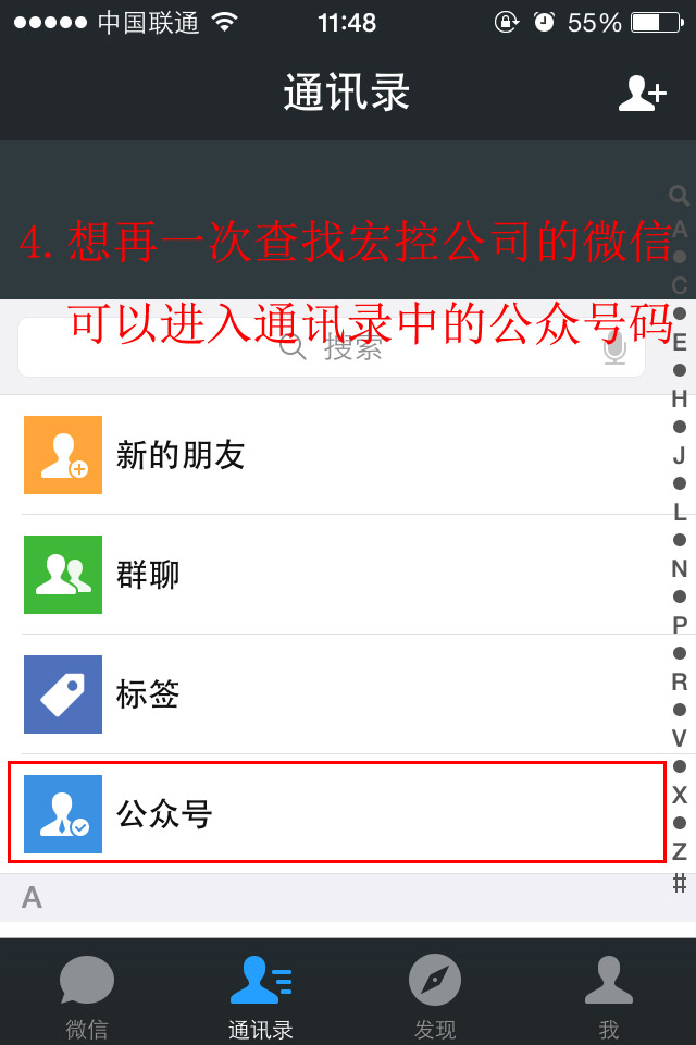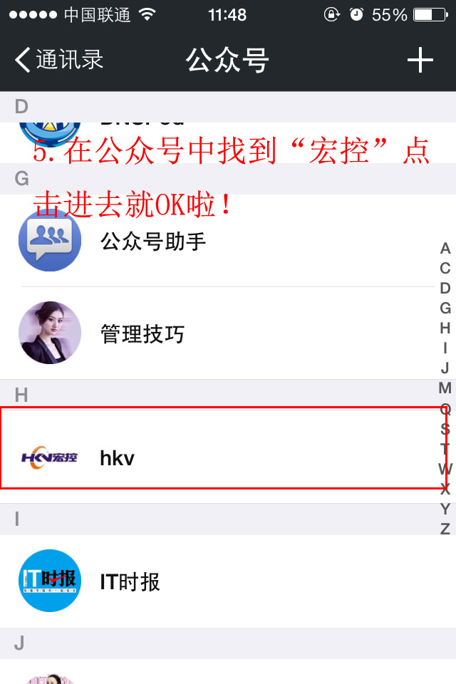 第四步:想找到關(guān)注的“宏控微信公眾號(hào)”在哪,進(jìn)入到微信通訊錄,選擇公眾號(hào),找到宏控HKV的公眾號(hào)即可